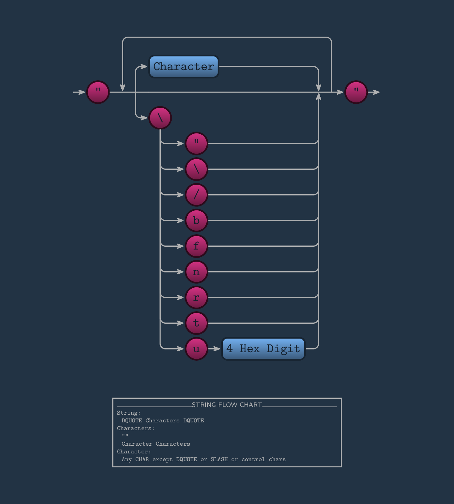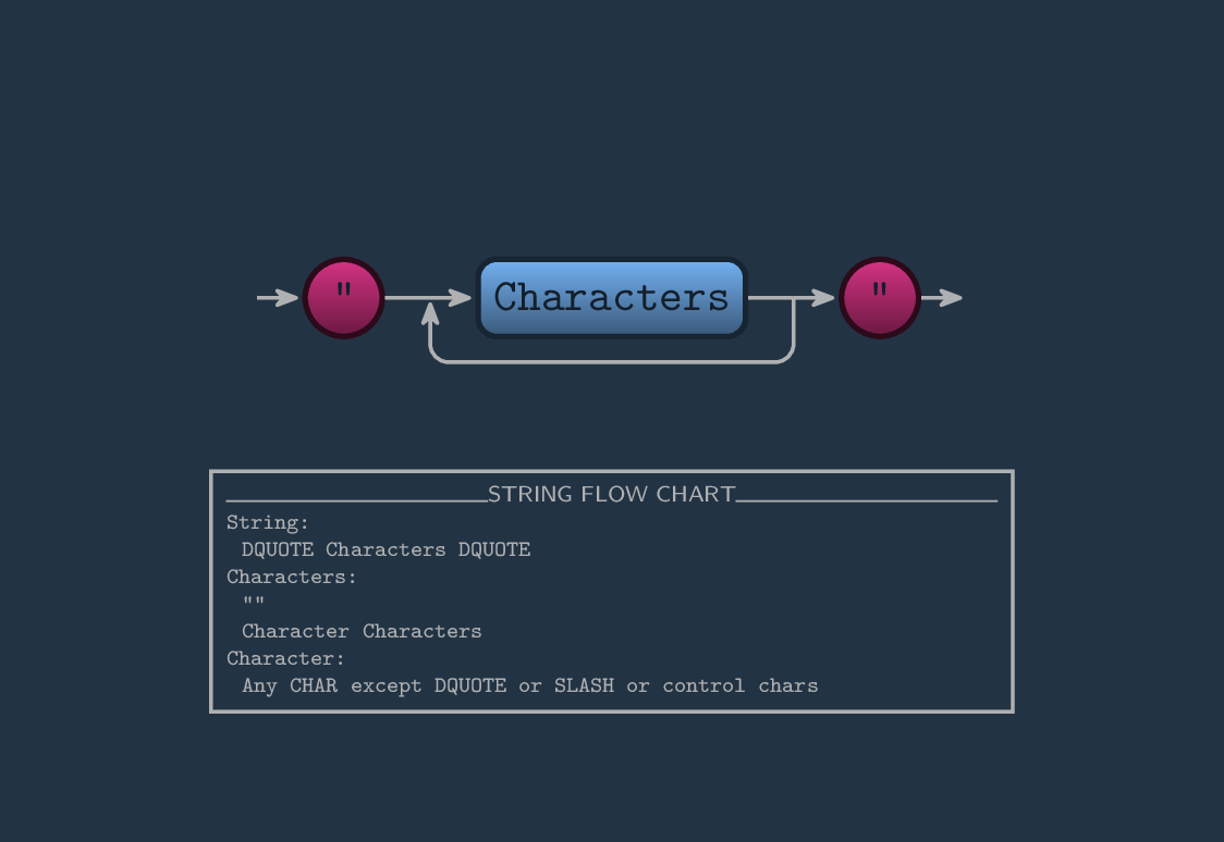 The first thing that we should do to capture stringify strings is know its definition. In basic terms, a string in that sense, is everything wraped by double quotes. If we would like to write a string in that way, first we write our first quote, then everything you wish, and then close it with the last double quotes. It is characterized by a string flow chart.